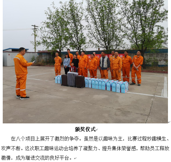 為進一步增強職工們的身體素質,豐富文體生活,增強凝聚力,在“五四”青年節來臨之際兗州文水分公司、呂梁分公司、中材文水分公司精心籌備,周密策劃的職工趣味運動會,在兗州文水分公司生活區如期舉行。本次運動會的主題是“以促進友誼為主,貴在人人參與,活躍公司氣氛”。以青年員工為主20多名干部職工參加了本次運動會。通過自娛自樂這種形式,增強團隊合作精神,培養職工熱愛運動,促進身體健康,增強公司凝聚力、戰斗力、號召力的目的。5月6日下午,三個分公司的職工趣味運動會,在經理王建立宣讀比賽規則后拉開了帷幕。此次活動由辦公室人員組織策劃,得到公司大力支持與全體員工的積極配合和參與。本次運動會共設有八個比賽項目: