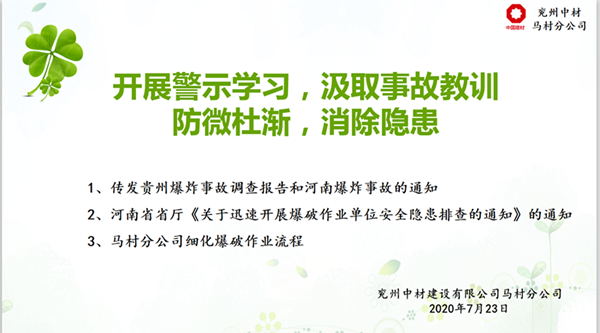 馬村分公司于723日下午在會議室舉行了“開展警示學(xué)習(xí),汲取事故教訓(xùn),牢筑安全防線”的會議,會議為大家轉(zhuǎn)發(fā)了貴州凱里市舟溪鎮(zhèn)3.19”較大爆炸事故調(diào)查報(bào)告》及河南欒川縣爆炸事故有關(guān)情況、河南省省廳《關(guān)于迅速開展爆破作業(yè)單位安全隱患排查的通知》。同時為了認(rèn)真貫徹“安全第一、預(yù)防為主”的方針,切實(shí)做好現(xiàn)場安全爆破作業(yè),并規(guī)范管理使用民用爆炸物品的工作,從根本上消除爆破安全隱患,杜絕爆破事故的發(fā)生,實(shí)現(xiàn)安全生產(chǎn),馬村分公司參會人員學(xué)習(xí)爆破作業(yè)安全規(guī)程的相關(guān)知識。