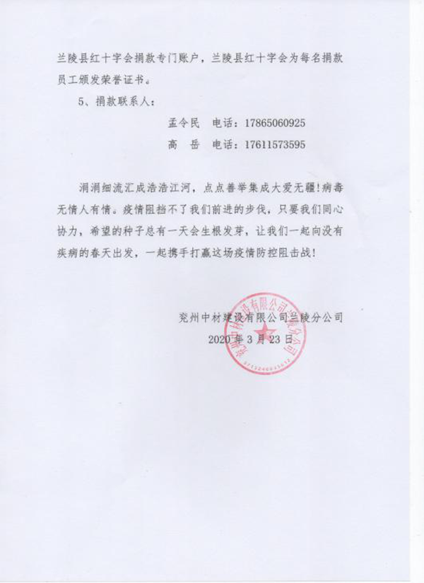 陽春三月,乍暖還寒。全國疫情防控工作取得重大勝果接近尾聲之際,仍有很多人士奮斗在抗疫第一線。災(zāi)害無情,人間有愛,近日來,蘭陵分公司積極響應(yīng)公司號召,組織開展為防控新冠肺炎疫情捐款活動,助力新冠肺炎疫情防控工作。   蘭陵分公司下發(fā)了《募捐倡議書》,堅持自覺自愿與量力而行的原則,呼吁全體員工積極參與,奉獻愛心,捐款助力抗擊疫情。分公司經(jīng)理龔士朋同志帶頭捐款,以實際行動做表率,起到很好的模范作用。在龔經(jīng)理的帶動下,分公司全體員工積極響應(yīng),紛紛捐款,每一名員工都獻出一份愛心。  經(jīng)過幾日的募捐,蘭陵分公司共籌集善款8000余元。3月25日,分公司安環(huán)科長孟令民同志,代表分公司將所籌善款轉(zhuǎn)交蘭陵縣紅十字會。紅十字會工作人員表示會將善款上交省紅十字會,全部用于新冠病毒疫情防控工作。并對捐款表示十分感謝,對此崇高的人道主義精神和奉獻愛心的善舉,表示誠摯的敬意。最后頒發(fā)給捐贈者榮譽證書。 涓涓細流匯成浩浩江河,點點善舉集成大愛無疆!病毒無情人有情。疫情阻擋不了我們前進的步伐,只要我們同心協(xié)力,希望的種子總有一天會生根發(fā)芽,讓我們一起向沒有疾病的春天出發(fā),一起攜手打贏這場疫情防控阻擊戰(zhàn)! |