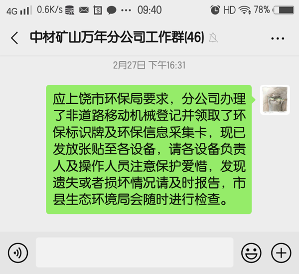 領取環保標識牌及其卡片后,分公司將申領的非道路移動機械環保標牌張貼于機械設備的左右兩側或機械尾端、操作手臂等明顯位置。 張貼完畢后要求各設備管理人員及操作人員必須注意保護好機械牌照及環保信息卡片,避免磕碰污損,以備檢查核驗。  今后,萬年分公司的非道路移動機械將像機動車一樣,擁有屬于自己的“身份證”。