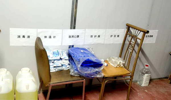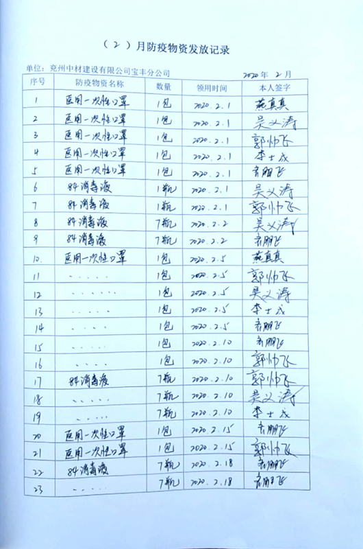 寶豐分公司復工復產前,針對防疫物資緊缺的情況,一方面請求業主代為購買防疫物資,另一方面請求總公司代為購買。截止2月25日寶豐分公司已購買口罩900個,84消毒液90kg,防護服8套,護目鏡8套,酒精5kg,紅外線電子額溫槍1部,水銀體溫計10個;防疫物資準備充足,滿足1個月用量。