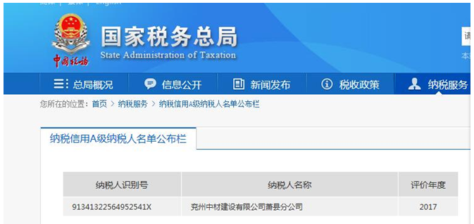 2018年6月15日,經(jīng)過(guò)在國(guó)家稅務(wù)總局官方網(wǎng)站查詢得知:兗州中材建設(shè)有限公司蕭縣分公司被評(píng)定為“A級(jí)納稅信用企業(yè)”。