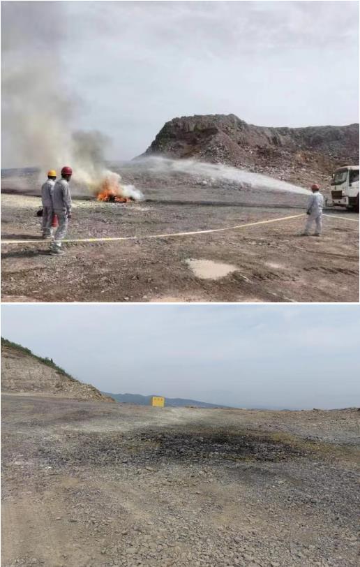 安全員李文生帶領搶險救援組在著火地外圍設置滅火陣地對火勢進行撲滅。設置多個手提式干粉滅火器堵截火勢,手推式干粉滅火器到達對火焰根部噴射滅火。