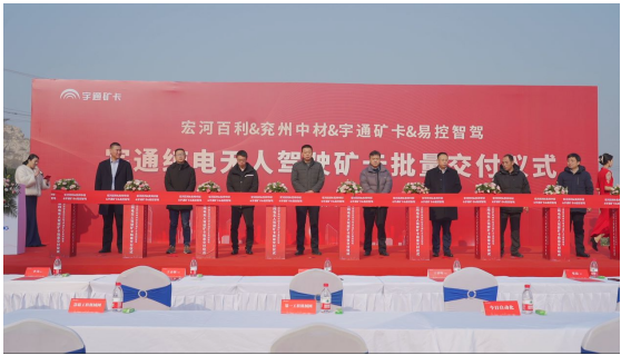 2022年12月28日,宏河百利、兗州中材、宇通礦卡、易控智駕四家企業(yè)代表在兗州中材鄒城分公司隆重舉行了純電無人駕駛礦卡批量交付儀式。