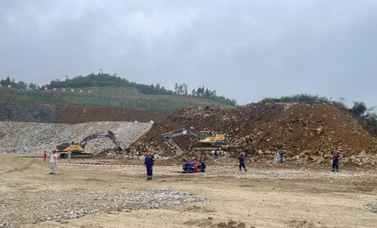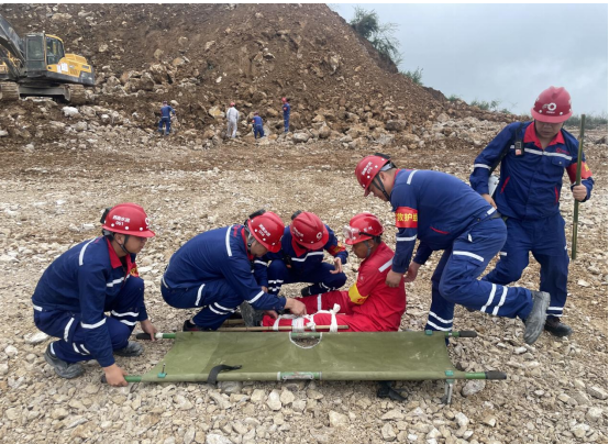 演練現(xiàn)場(chǎng)模擬遇強(qiáng)降雨后邊坡發(fā)生垮塌事故,在接到險(xiǎn)情報(bào)告后,應(yīng)急指揮部立即啟動(dòng)應(yīng)急預(yù)案,組織各救援小組趕赴現(xiàn)場(chǎng)